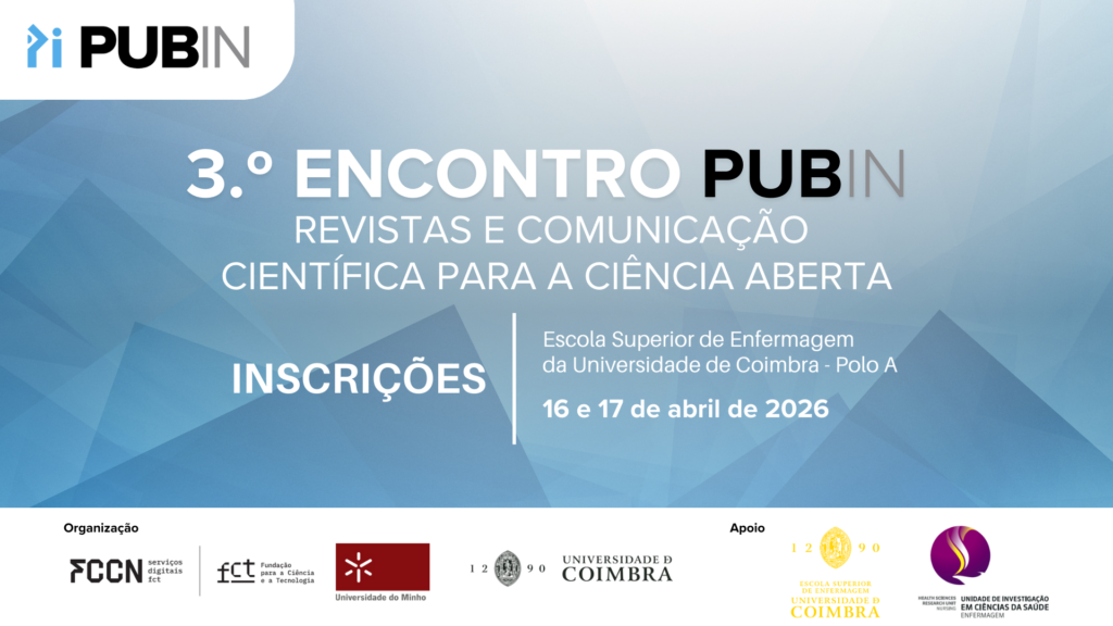 Estão abertas, até dia 10 de abril, as inscrições para o 3º Encontro PUB IN: revistas e comunicação científica para a ciência aberta que se realiza nos dias 16 e 17 de abril, na Escola Superior de Enfermagem da Universidade de Coimbra – Polo A.